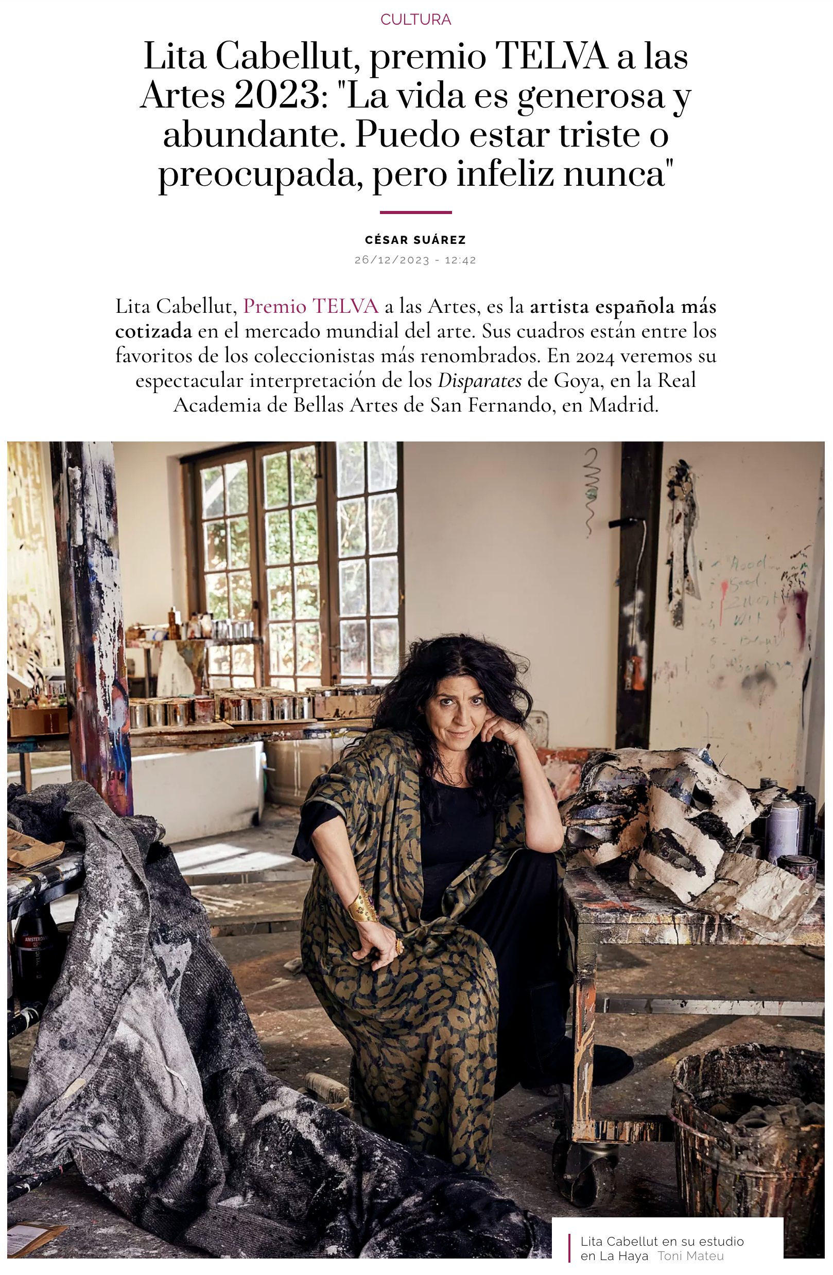 La casa-estudio de Lita Cabellut en La Haya es una antigua fábrica de carrocerías de madera para coches. Está muy cerca de Binnenhof, la sede del gobierno de los Países Bajos, con su famosa estampa del estanque Hofvijver, y de los edificios que albergan los numerosos tribunales internacionales de la ciudad. Cuando hace diez años vio esta nave abandonada, dijo: "Este es el sitio". Nadie imaginó que este lugar pudiera convertirse en lo que hoy es, salvo ella. Toda su vida ha funcionado por corazonadas, con el afán de rescatar y recuperar lo que estaba perdido, olvidado o roto, ya fueran personas, objetos o casas.
